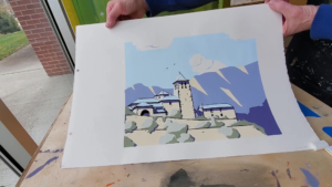 This serigraph is developed from a pen & ink sketch I did in northern Spain during an urban-sketching trip. It depicts the lovely Church of San Salvador in the mountain village of Torla-Ordesa. Read about this subject in “Torla-Ordesa: The Story” in the Artist’s Insights Blog.