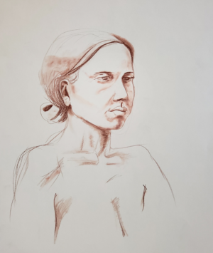 This original portrait is drawn from a live model in an hour using two drawing mediums of the same color. It features my usual style of exaggerated lines. Conte crayon is like charcoal with a little wax to bind it better to the paper. I ground some of that color and applied it with a soft-tipped drawing instrument. The natural color of the paper adds to the warm tone of the drawing. Colored pencil and Conte crayon on Strathmore 400 drawing paper 18x24". 2025. One only.